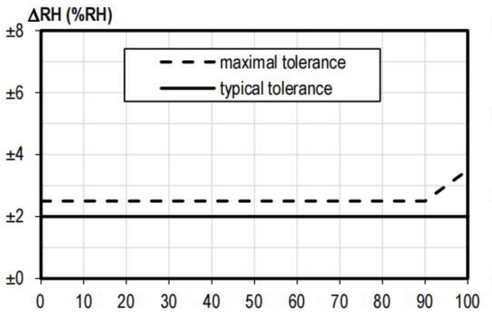 在推薦的正常溫度和濕度范圍(分別為5°C~60°C 和 20%RH~80%RH)下運行時, 傳感器顯示出最佳性能。長期暴露在正常范圍以外的條件下,特別是在高濕度下,可能會暫時偏移相對濕度信號(例如:在大于80%相對濕度的環境下保持60 小時后,會偏移3%相對濕度),在回到正常的溫度和濕度范圍后,傳感器將緩慢地自行回到校準狀態;長期暴露在極端條件下可能加速老化。